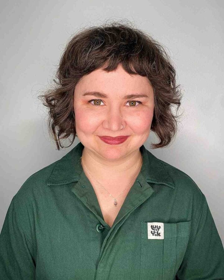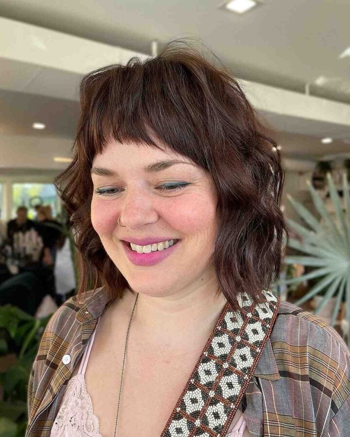 Achieve a fun and flirty look with a short face-framing shag cut paired with mini choppy bangs. This shaggy bob style is ideal for women embracing their natural texture, offering a rounded shape that’s easy to style and maintain.
