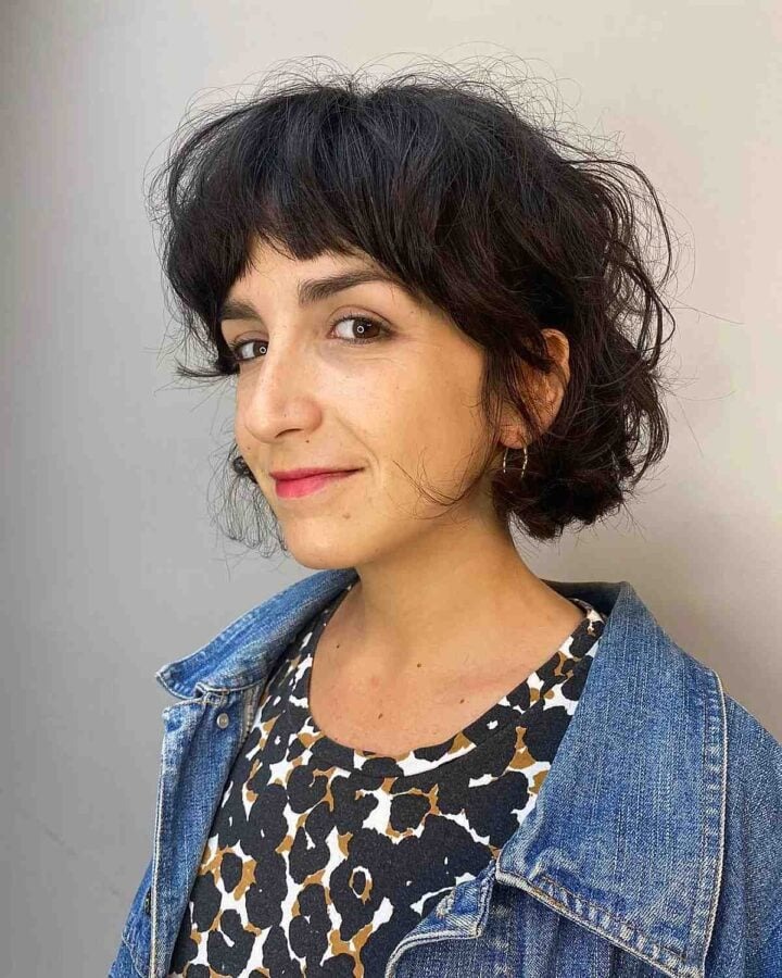 Opt for a statement look with a shaggy bob featuring micro bangs and styled with big waves. Textured bobs with bangs offer a bold and trendy aesthetic. For those with thick hair, opting for a short hairstyle accentuates fullness and highlights natural curls beautifully. Incorporating a fringe with textured hair creates a flattering round shape, particularly suitable for young to middle-aged women.