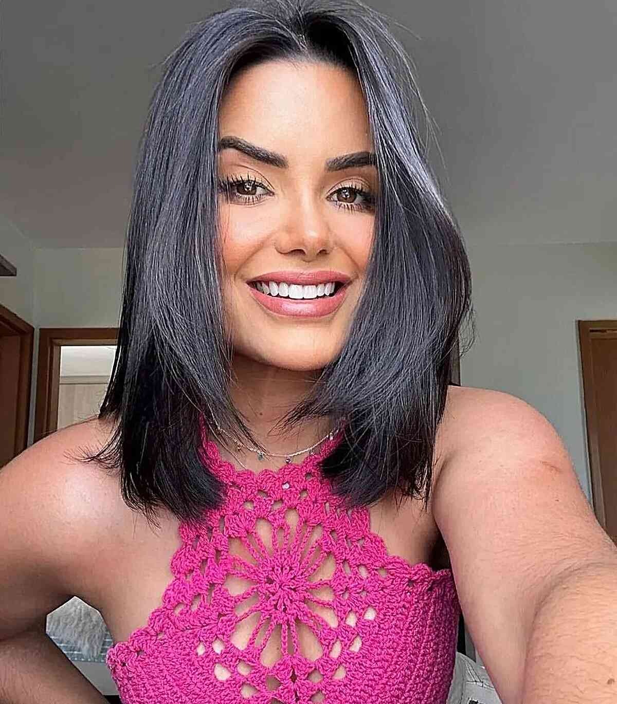 Enhance your casual hairstyle with a face-framing full fringe, drawing attention to your eyes and cheekbones for added allure. Incorporate an oil product to tame flyaway hair and provide moisture to dry locks, ensuring a polished finish to your chic and effortlessly stylish look.