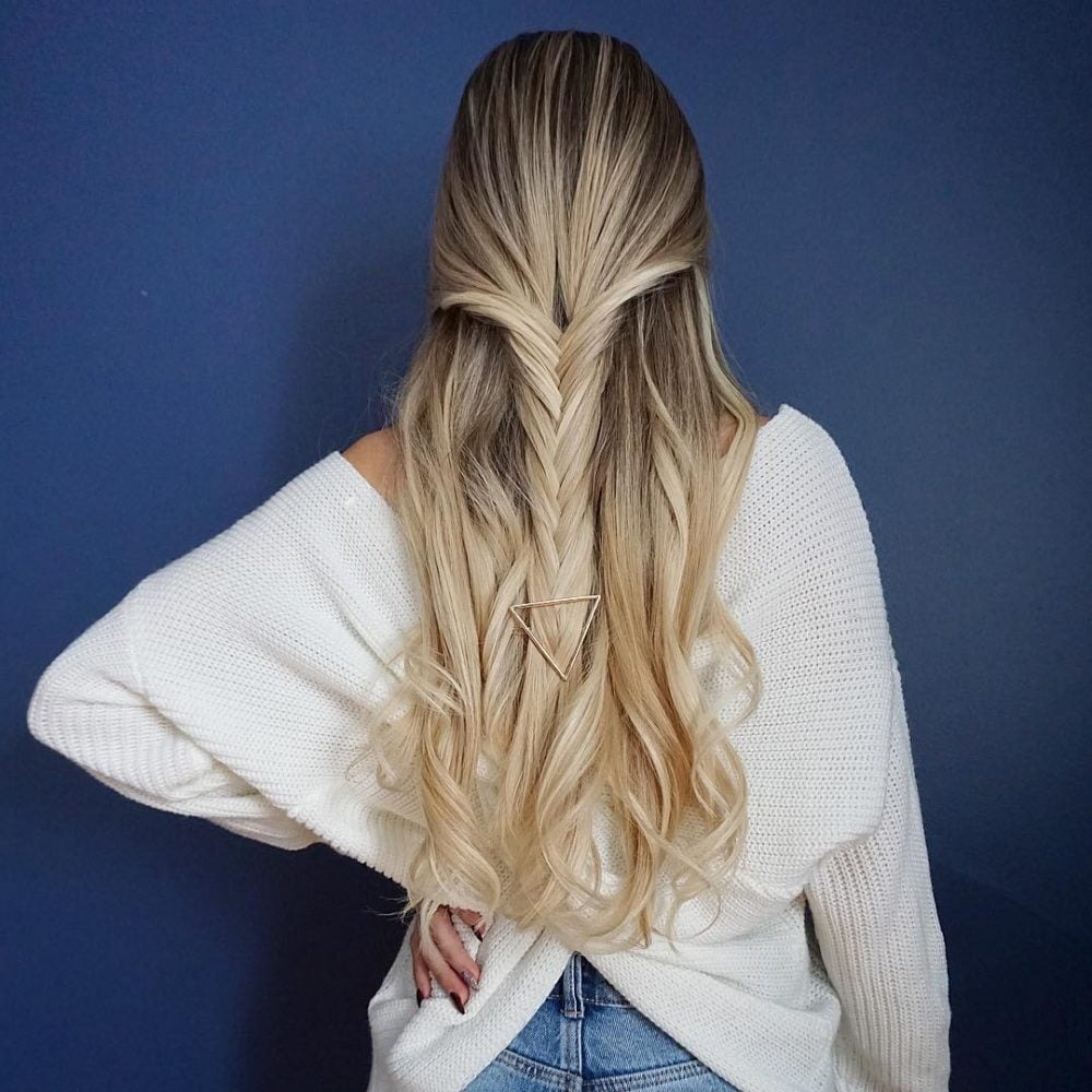 Achieve a stylish and casual look for your long hair effortlessly by weaving your strands into trendy fishtail braids. This simple yet chic hairstyle adds a touch of flair to your appearance with minimal effort.