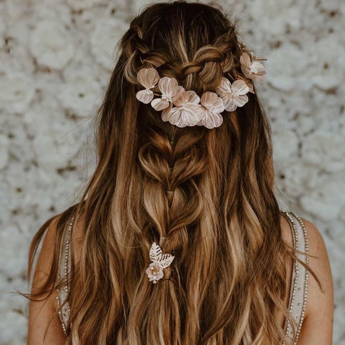 Infuse your look with easy romance using side braids complemented by a soft, wavy texture through the mid-lengths. The versatility of this style allows you to seamlessly transition from a casual brunch-date hairdo to casual updos for a formal event. Elevate the elegance by incorporating a few pearl pins, adding a touch of sophistication and charm to this effortlessly romantic look.