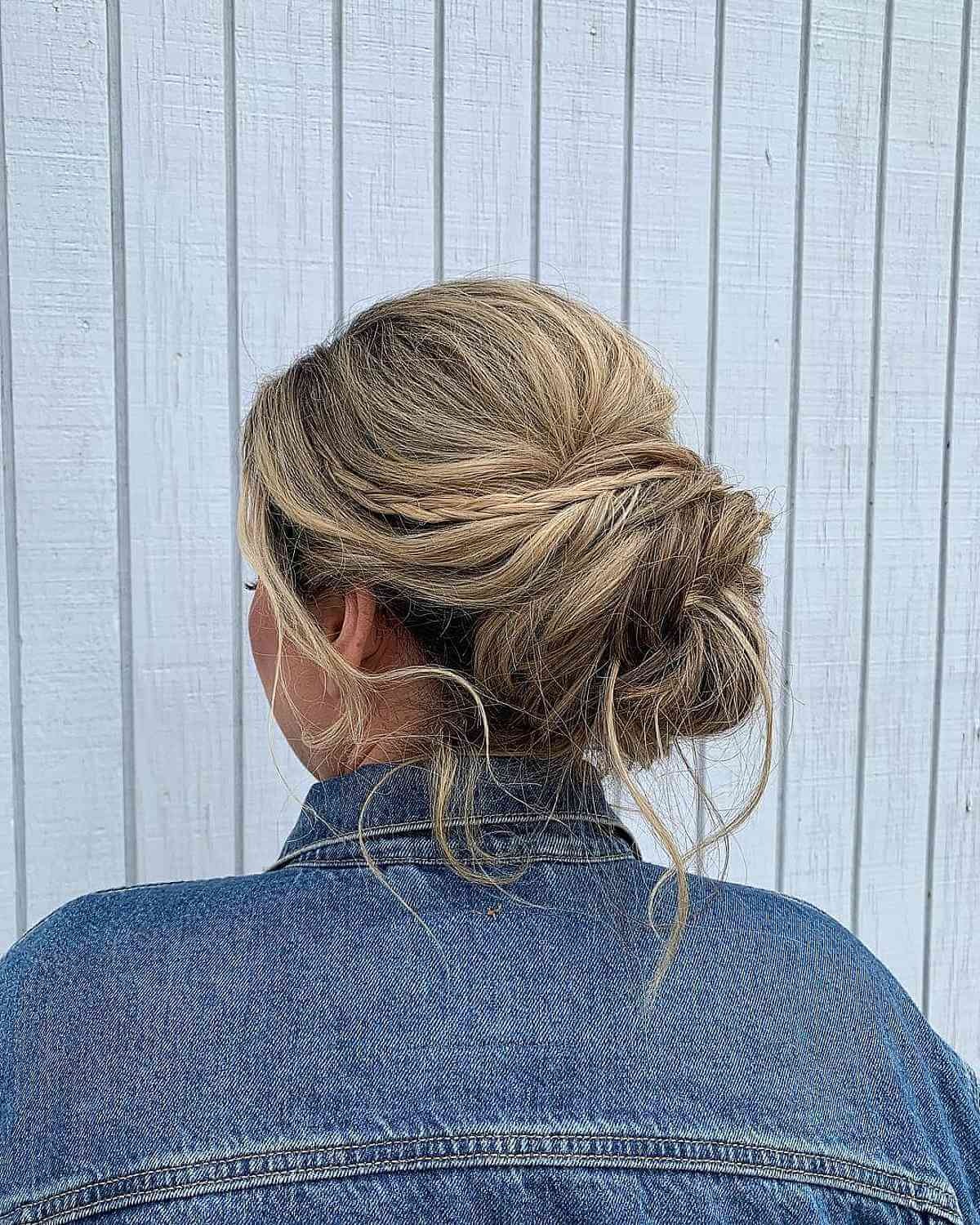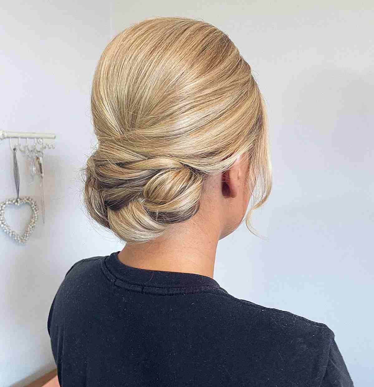 Opt for a casual and chic vibe with a messy blonde low bun, perfect for those times when you want your updo to have a laid-back feel. Soften the look by leaving out face-framing strands in the front and along your hairline. To enhance the effortless charm, let a few strands of hair escape from the bun. Ensure the longevity of your look by finishing it off with a good spray of finishing hairspray, ensuring your style lasts throughout the night.