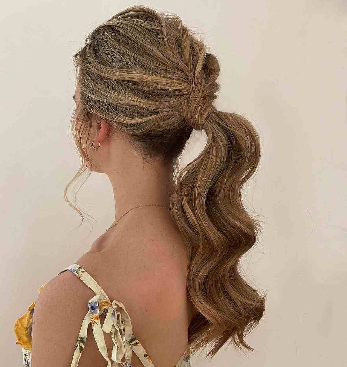 Achieve a casual and boho-inspired look with a wrap-around ponytail, a simple yet beachy updo that works best with long hair. Utilize the length of your hair to wrap it around and hold the ponytail together, adding a touch of elegance to the effortless style. For a laid-back and charming appearance, style the messy low ponytail with plenty of texture and curls, embracing the beauty of casual updos for long hair.