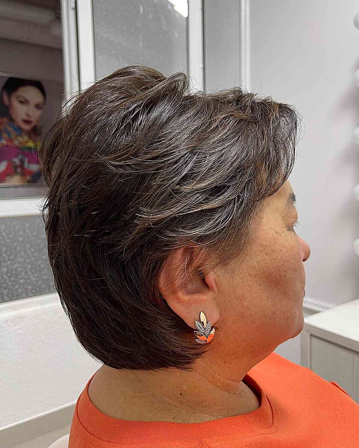 Imagine a chic pixie bob adorned with delicate layers and fringe. The feathery layers cascade gently, creating a sophisticated appeal tailored for those with fine hair. The subtle waves at the nape of the neck not only add a touch of softness but also offer a clever disguise for any hints of aging, granting a more youthful appearance. As for styling, achieving that effortlessly tousled effect is a breeze – simply opt for a quick blow-dry using your fingertips.