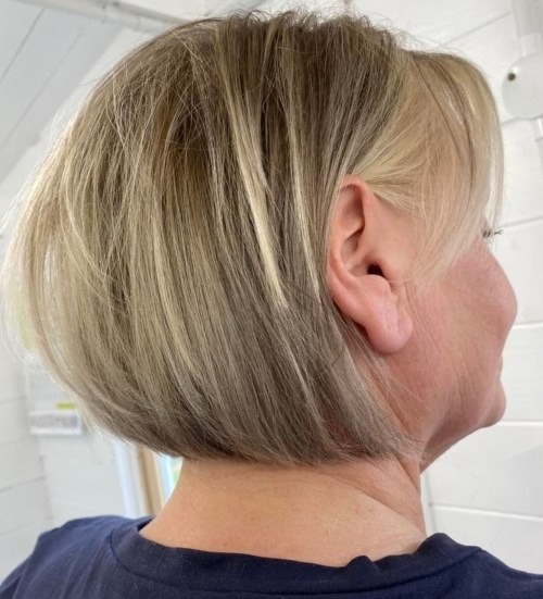For those seeking voluminous flair, opt for a rounded concave bob with blonde highlights. Request a narrow neckline that seamlessly transitions into a stacked crop at the back of your head for maximum fullness. The angled shape of this hairstyle is achieved through over-directed layers from the front to the back, resulting in a lovely and stylish look.