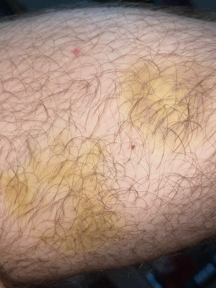 Yellow or brown spots resembling bruises may be indicative of a condition called necrobiosis lipoidica, which results in patches of rough or hardened skin. Though rare, this condition can be effectively treated with proper care.