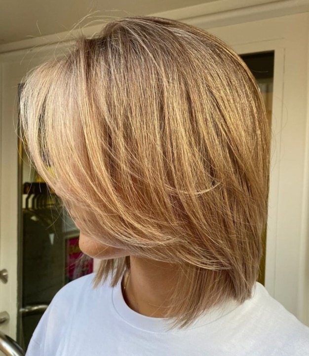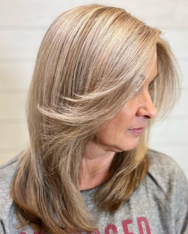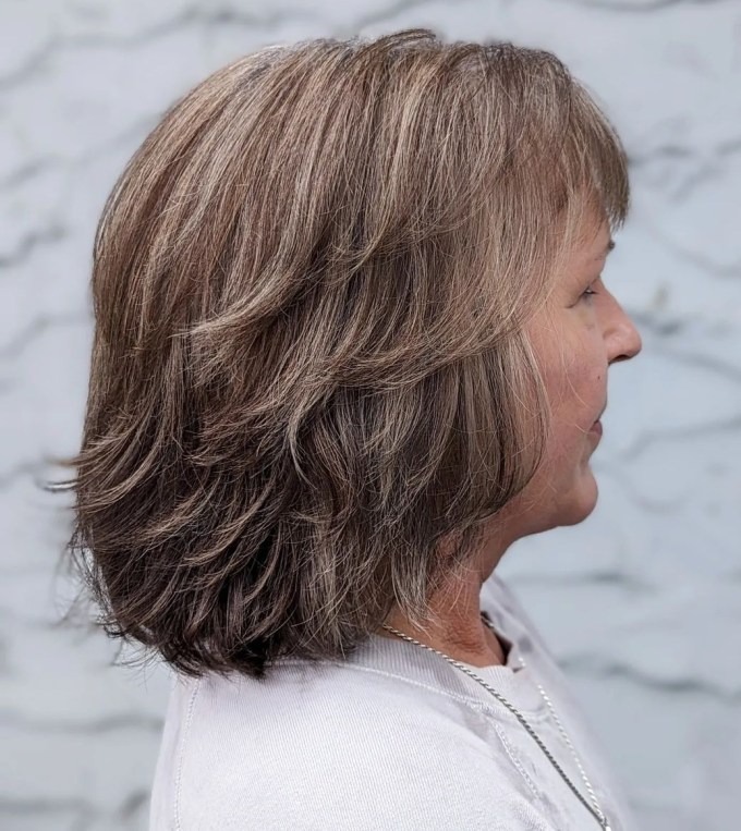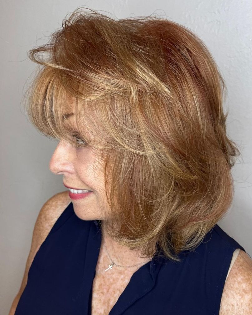 Impeccably layered and feathered, this medium-length hairstyle curated for women over 50 embodies a harmonious blend of glamour and practicality. Not only does it radiate elegance, but it also effortlessly combines style with convenience. Its inherent versatility allows for easy styling, ensuring you remain fashion-forward without compromising on comfort. Plus, its low-maintenance nature adds an extra layer of appeal, making it the epitome of chic and effortless elegance.
