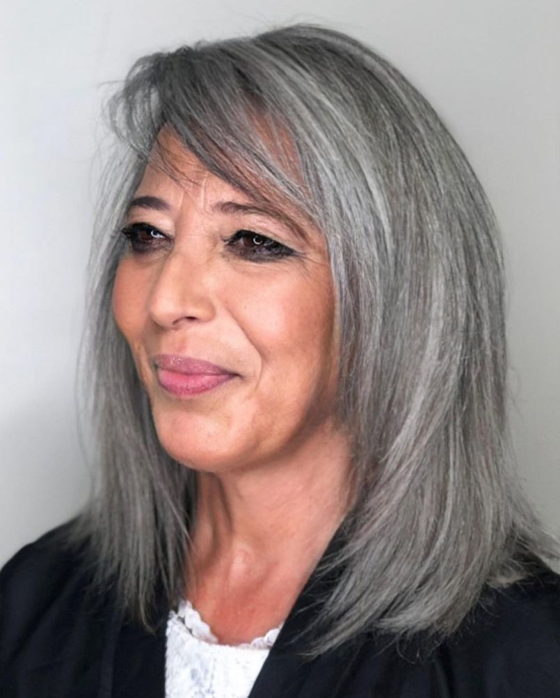 For a chic and trendy statement, consider opting for a stunning long mullet-like haircut accentuated by bangs. The lengthy, swoopy bangs and captivating blonde highlights combine seamlessly to create a standout style, making it a favorite among popular mid-length haircuts for older women. This edgy yet sophisticated choice effortlessly blends modern glamour with timeless elegance, allowing you to embrace a bold and contemporary look while exuding confidence and grace.
