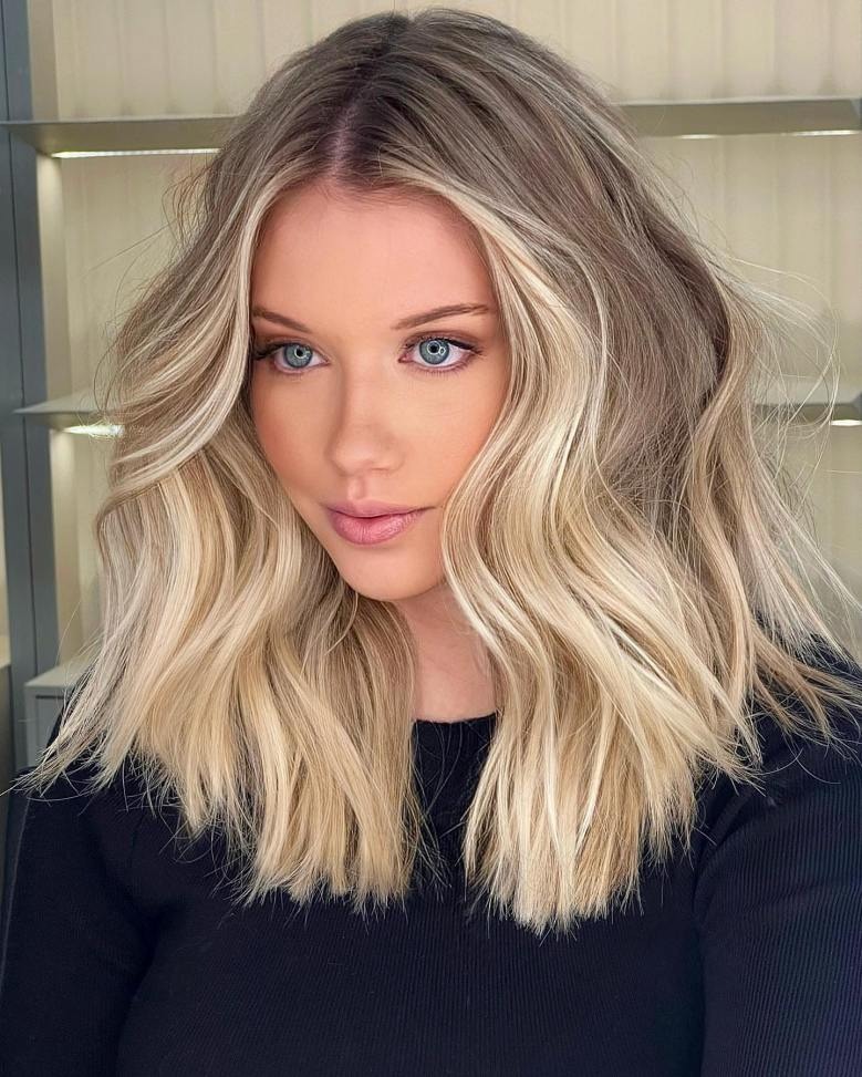 Adorned with gentle beachy waves reminiscent of tranquil lake ripples at dusk, this shoulder-length hairstyle is undeniably stunning. The combination of stripey brown lowlights and blonde highlights enhances the captivating aura, infusing a fascinating and soothing elegance into the overall look.