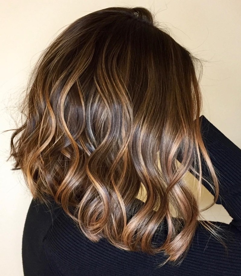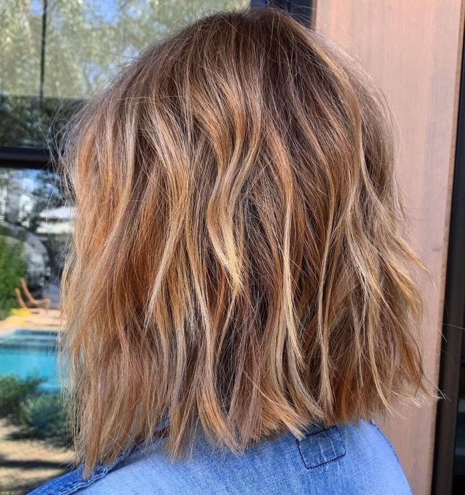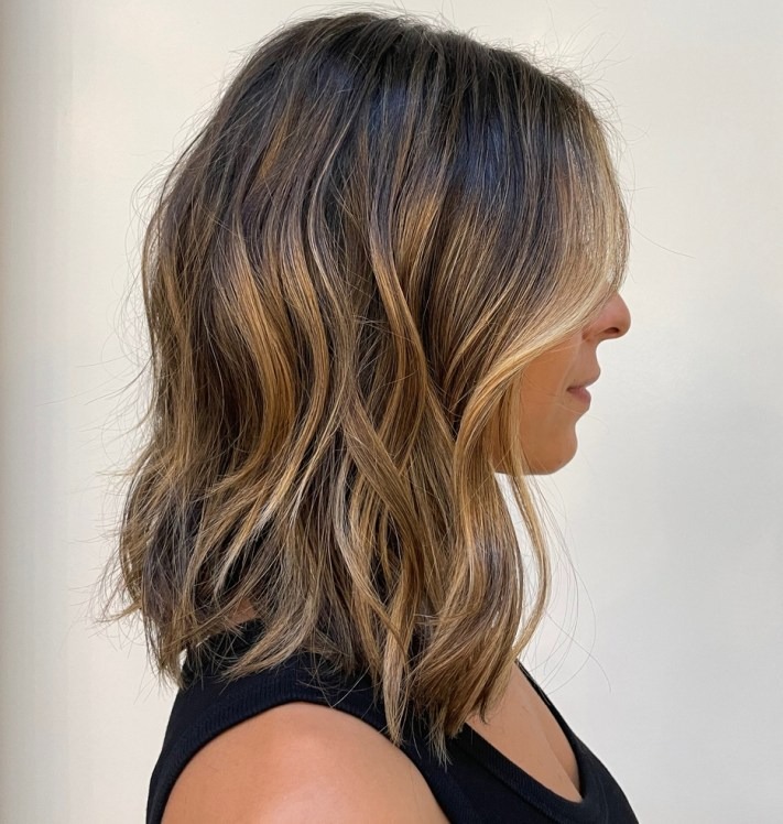 Medium hairstyles featuring a caramel balayage are highly sought after. This amazing shaggy lob gives shoulder-length hair a naturally sun-kissed appearance. Its low-maintenance allure lies in the seamless blend of colors, ensuring roots don’t grow out noticeably. Personalize the look further by incorporating layers, enhancing the style’s elegance and individuality.
