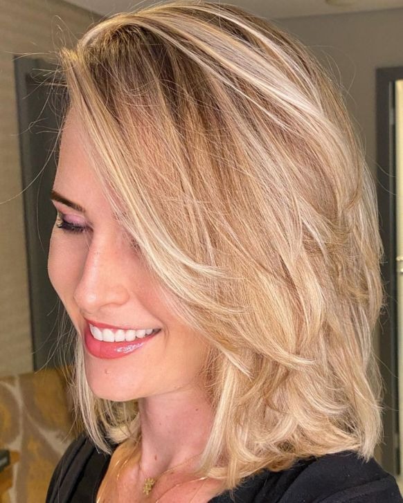Highlighting medium-length haircuts for fine hair is a wise choice, especially in this lob that combines a dimensional effect with depth-enhancing root melt and a face-illuminating golden blonde money piece, creating an elegant and dimensional hairstyle.