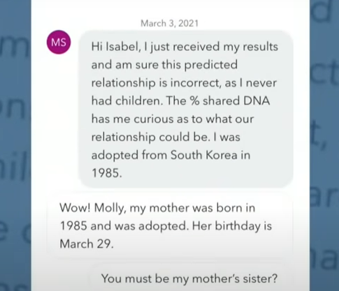 En un giro del destino, Isabel recibió sus resultados casi al mismo tiempo que Molly, en Florida, quien también se había hecho una prueba de ADN.