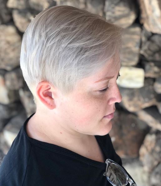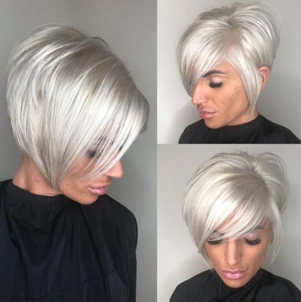 The icy blonde hair for this cut makes the short hair come alive. The swept over hair adds style to a short cut but it is all about the color that really makes it pop.