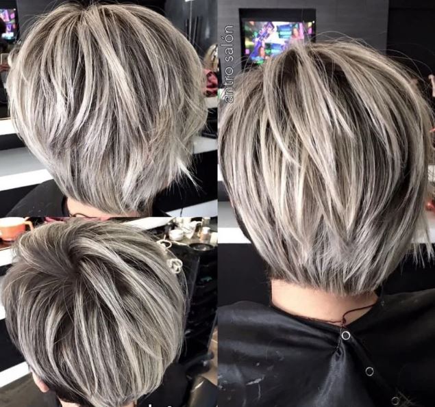 This cut helps, “… take advantage of the natural changes in your hair by mixing in hints of metallic blonde and silver to make your gray shine. Pair the color with a modern pixie cut and long side bangs to complete your new flirty hairdo.”