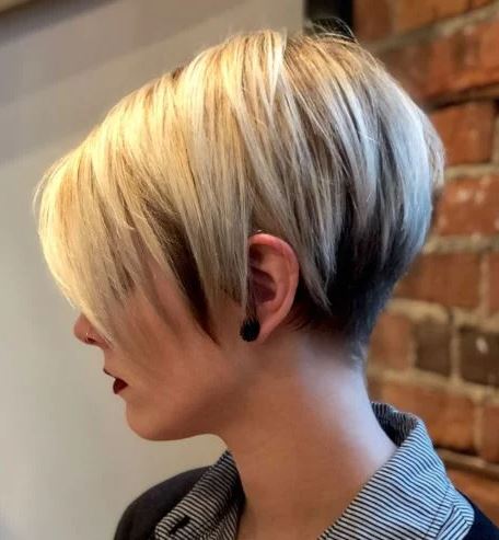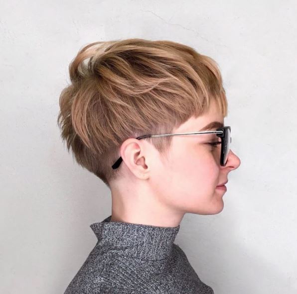 The two colors within this hairstyle shows off the sleekness of the cut. The pixie cut with the side part is shown off with the blonde hair. Yet, it is the darker brown undercut at the nape of her neck that really makes the blonde pixie cut stand out.