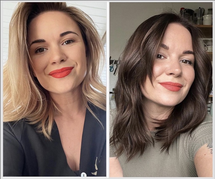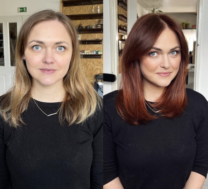 Who would have thought darker auburn hair could lighten your look? The new hair color made her eyes pop and her smile brighter.